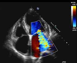 One interesting thing was that before the surgery, they weren't entirely sure whether they were going to be repairing the tricuspid valve. So the anesthesiologist did an echo by sliding a probe into the patient, near the patient's heart, and rotating the probe to look at the different valves on a screen. He could also turn on a blood flow feature, which showed us different colors, each color illustrating a different blood velocity. This allowed us to see whether there was regurgitation, aka "regurg," which there was, from all three valves in question. (The image of a heart echo above shows mitral regurgitation, or blood flowing in the wrong direction, similar to what this patient had.)